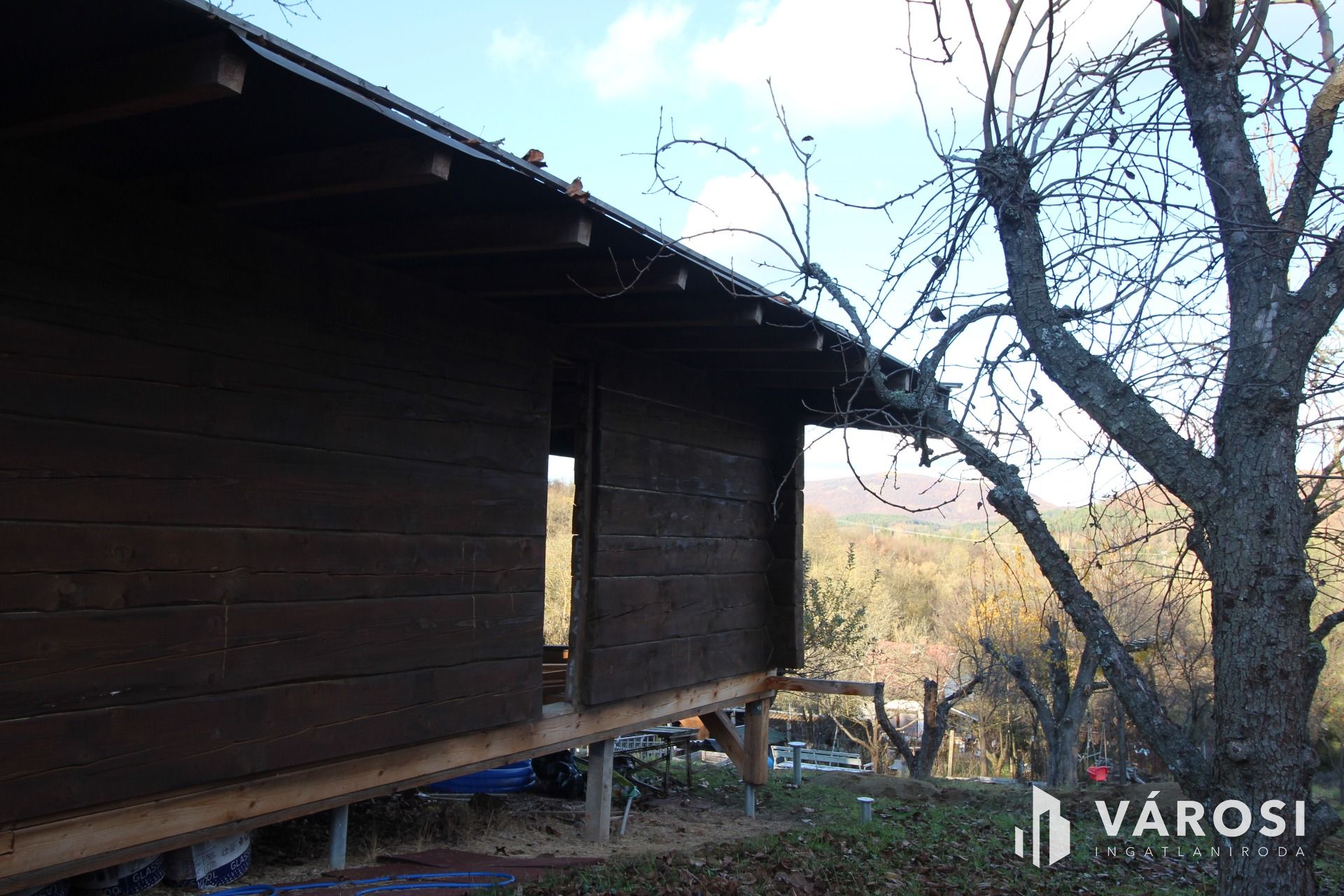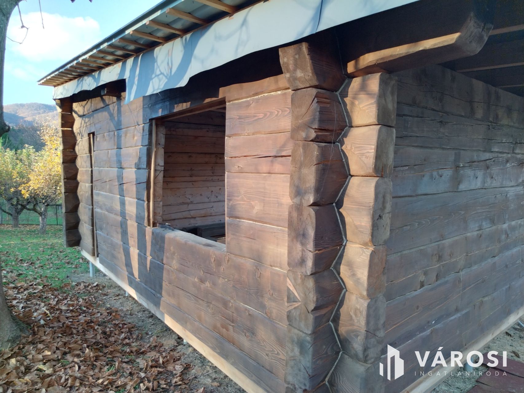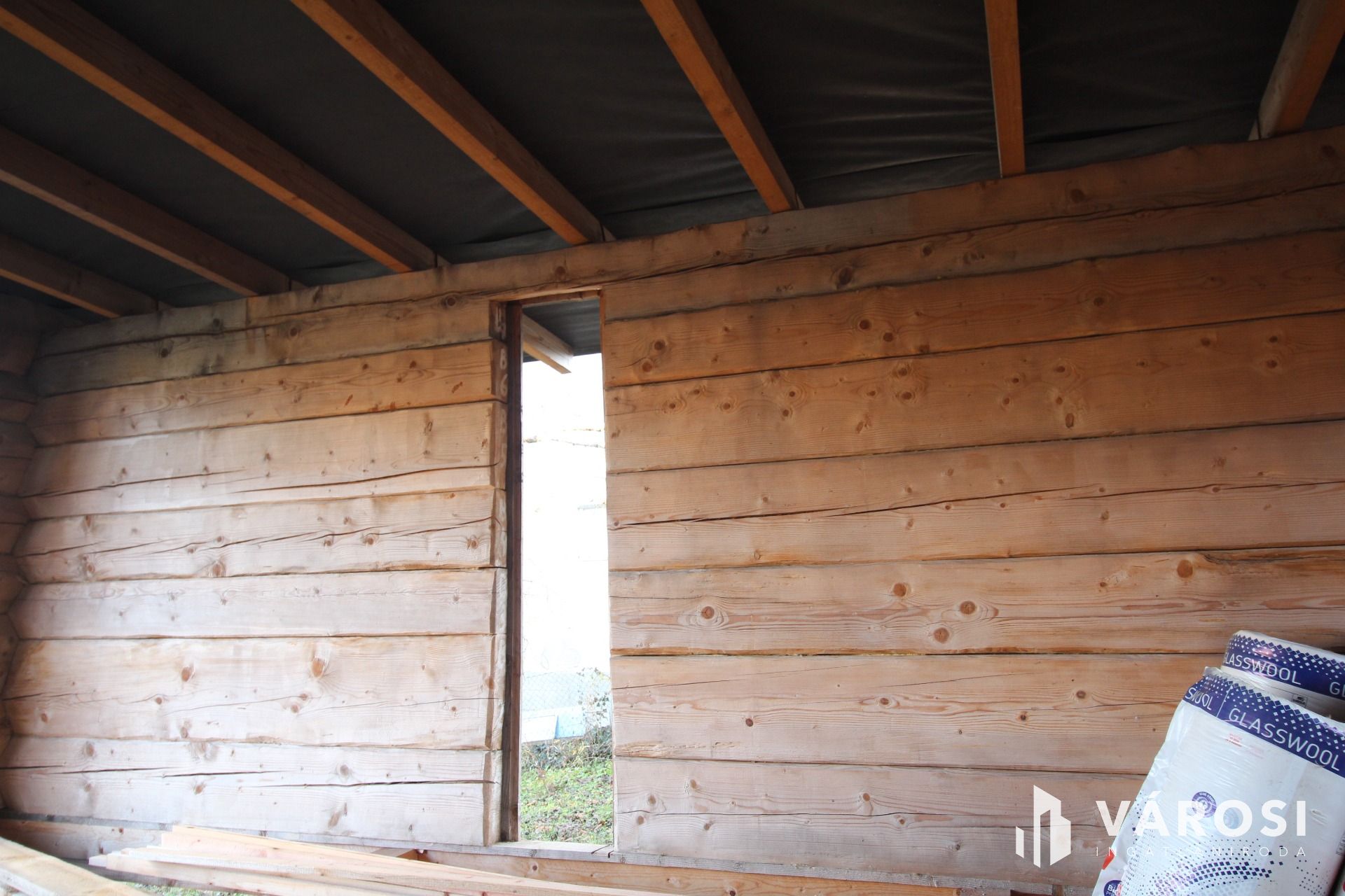 A rönkház szerkezete már készen van, a tetővel együtt. A nyílászárókat, az alsó padozatot, és a mennyezeti szigetelést kell még beépíteni.