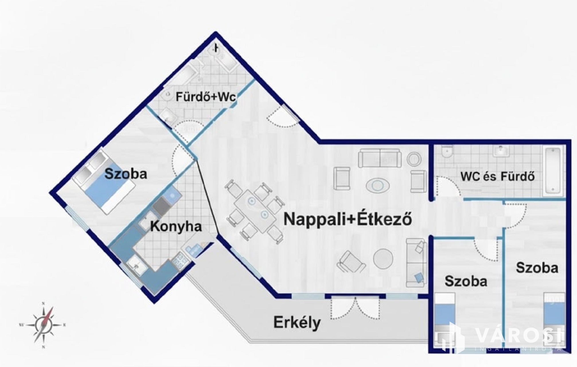 Az ingatlan elrendezése praktikus és jól bútorozható: nappali–étkező + 3 félszoba, így ideális lehet családnak, home office-ra, vagy akár befektetésnek/kiadásra is. A lakás déli tájolású, utcai kilátású, és egy 8 m²-es erkély is tartozik hozzá.
