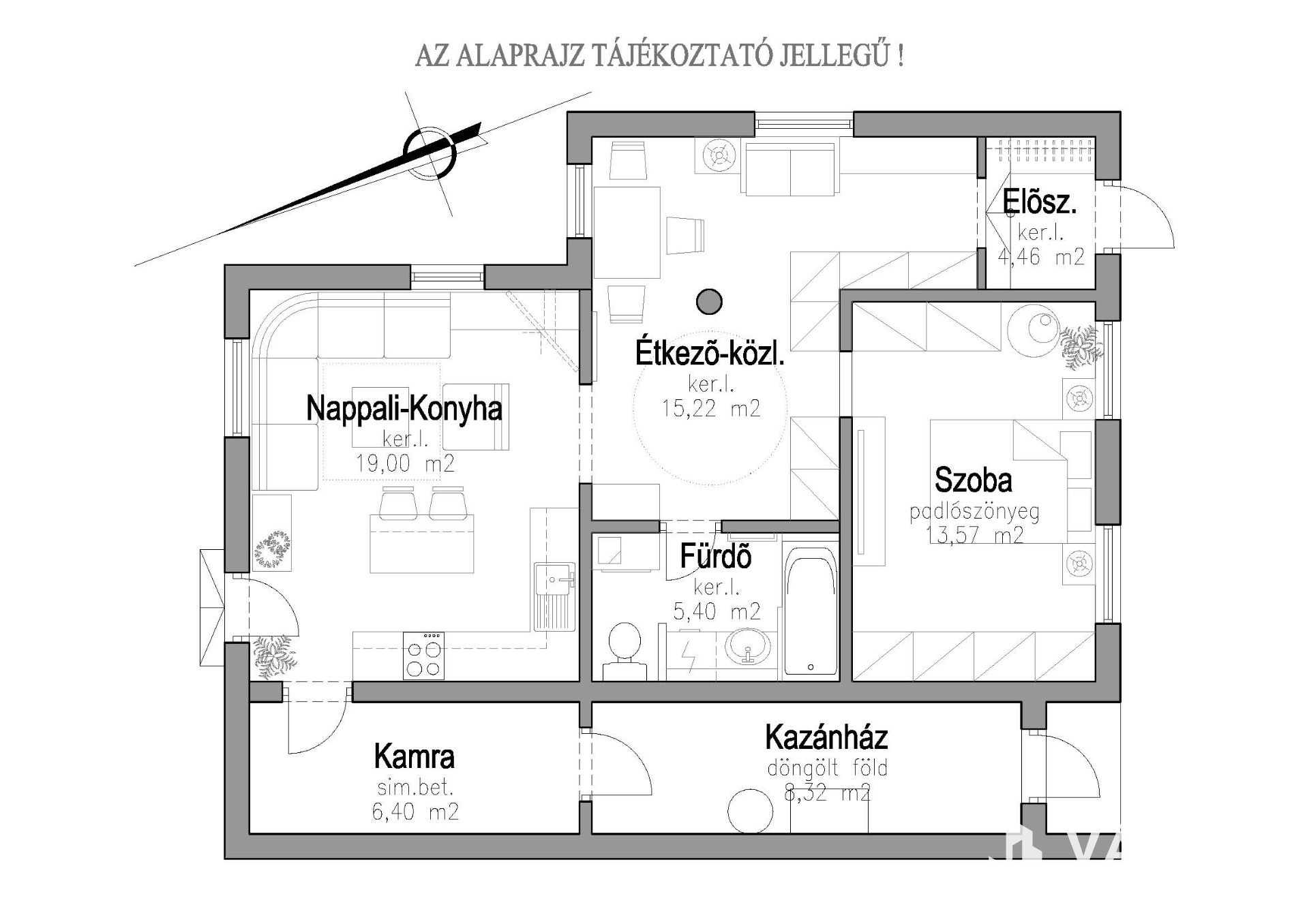 - Nappali-Konyha: ~19,00 m2