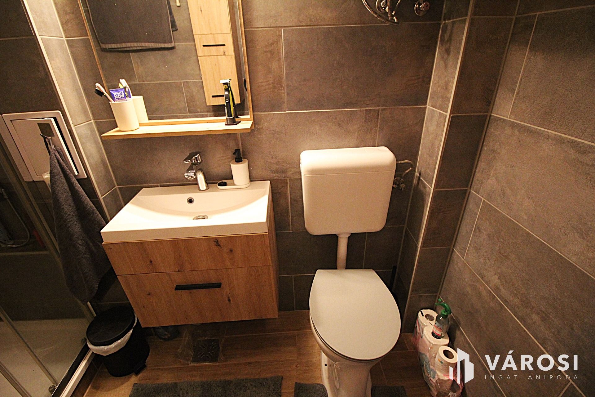A fürdőszoba elegáns falburkolatokkal, járólapokkal, stílusosan lett kialakítva.