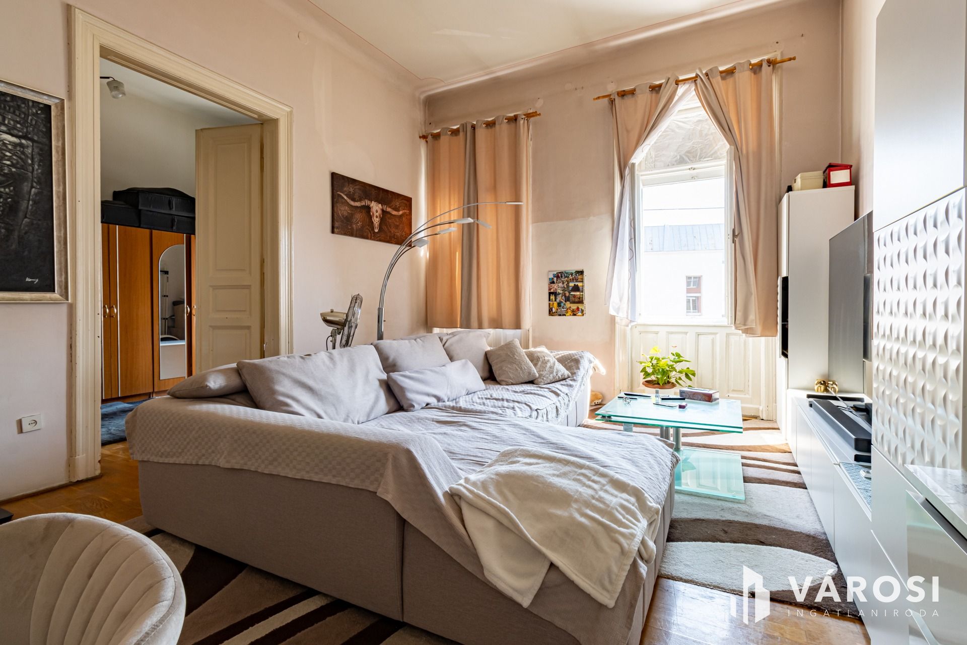 For sale in Budapest’s 8th district, on II. János Pál pápa Square,a bright, second-floor, two-room apartment, which can beconverted into a three-room layout if desired.