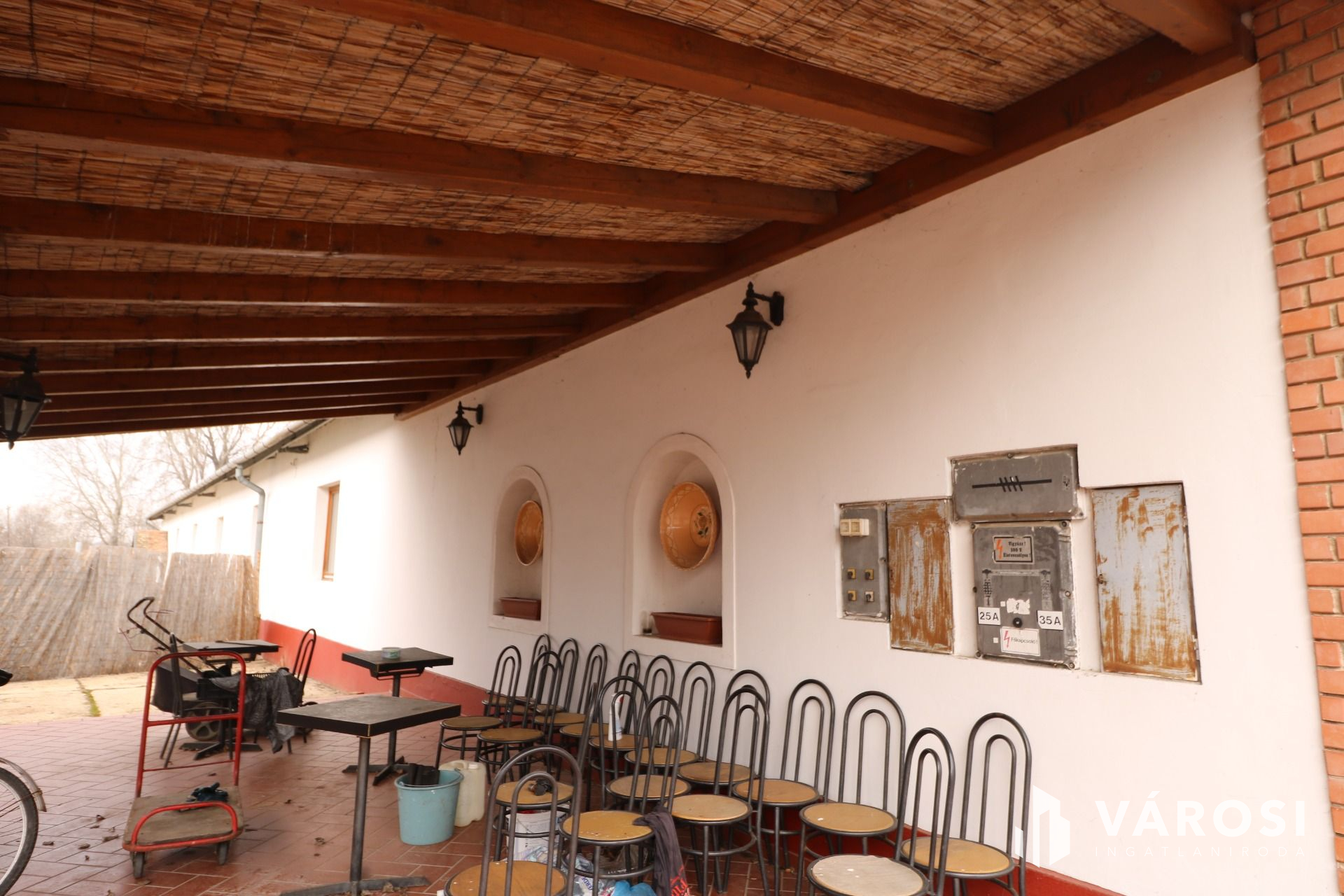 Betonozott padló, acélvázas tetőszerkezet, lemez tető, 40 cm-es téglafal.
