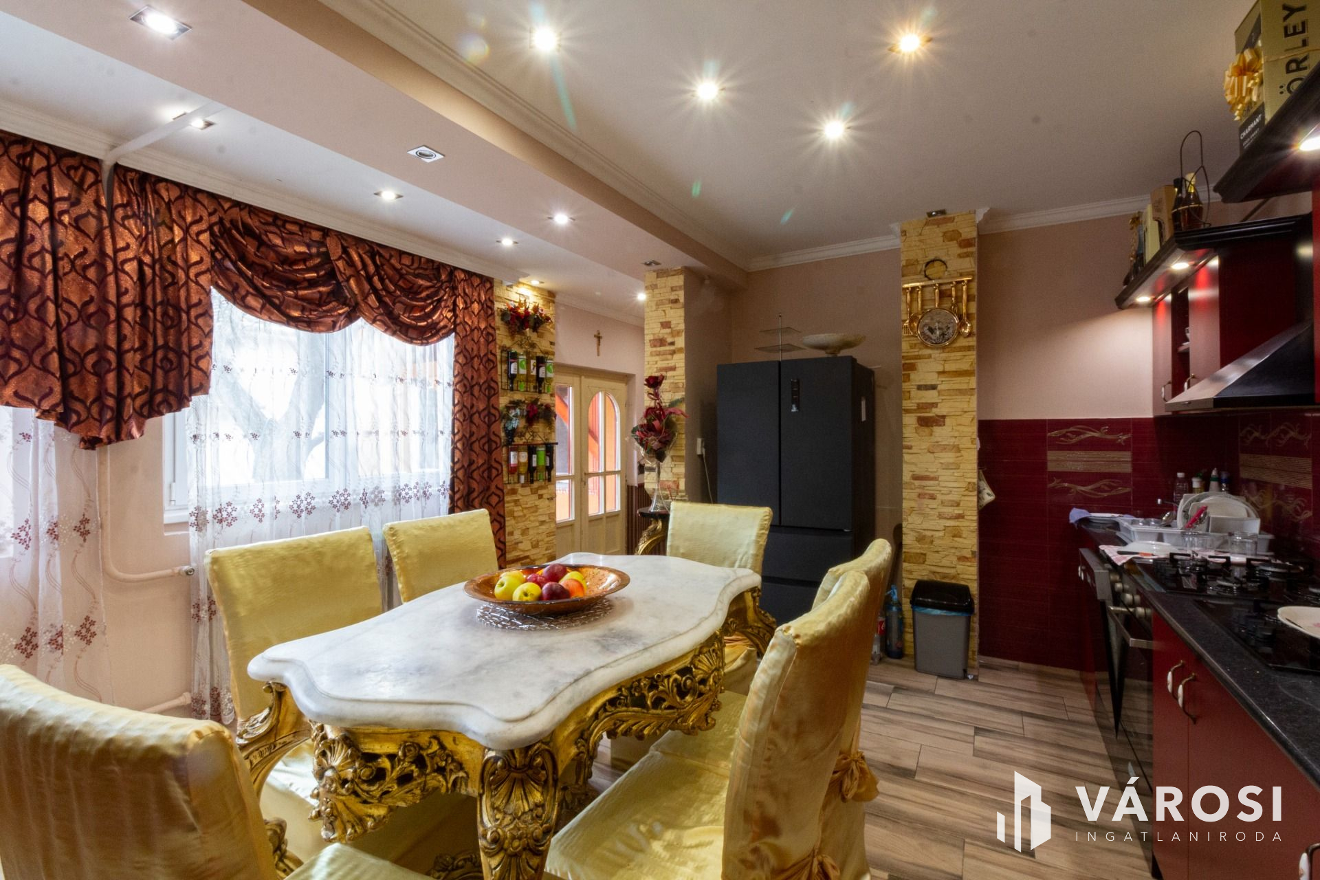 A lakásba belépve jobbra az amerikai konyhás étkező, balra pedig a nappali található, amelyből további két szoba nyílik. A szobák parkettások, a többi helyiség hidegburkolatú. Az L alakú ingatlan hátsó részében, külön bejáratú apartman lett kialakítva. Albérletnek kiadható lakrész.