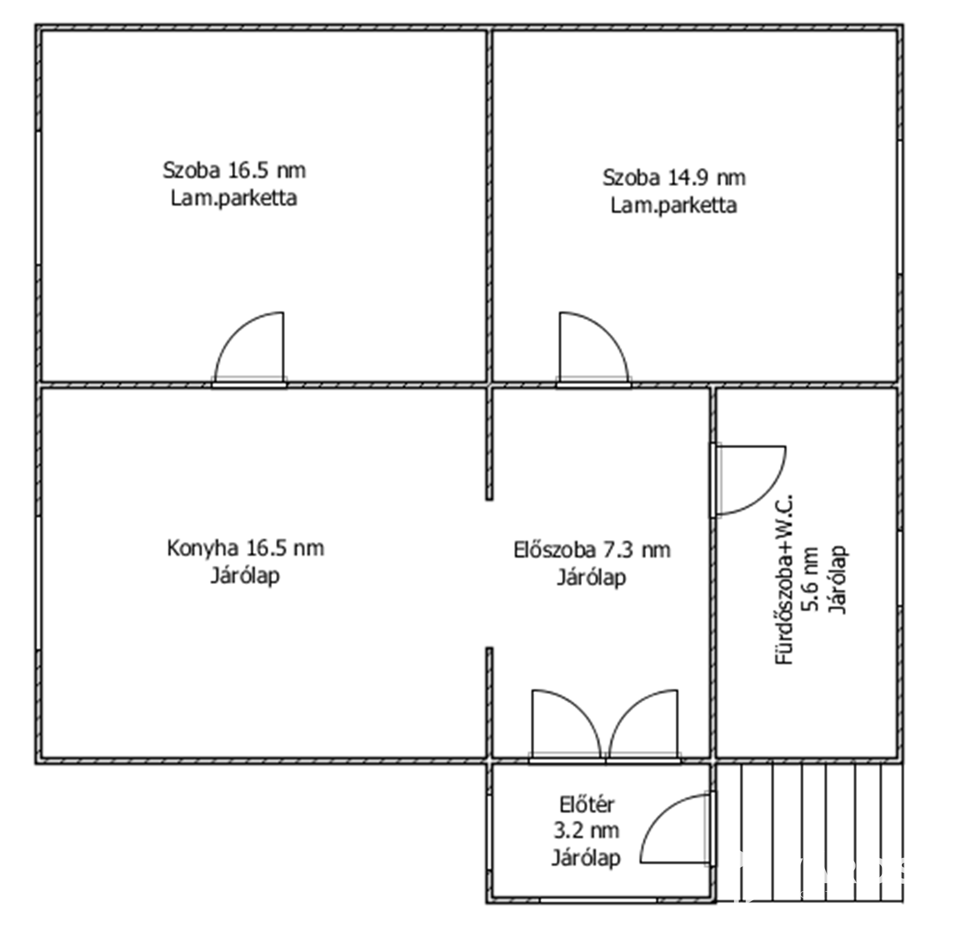 Helyiségei: a felső szinten előszoba, 2 szoba, konyha, fürdőszoba, előtér, az alsó szinten 34 nm-es pince/tároló.