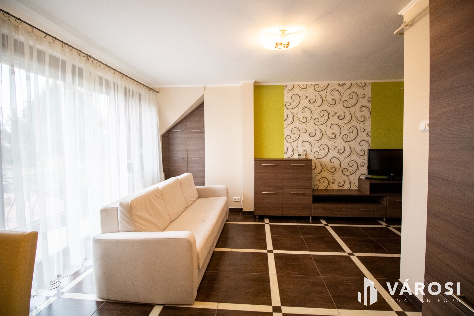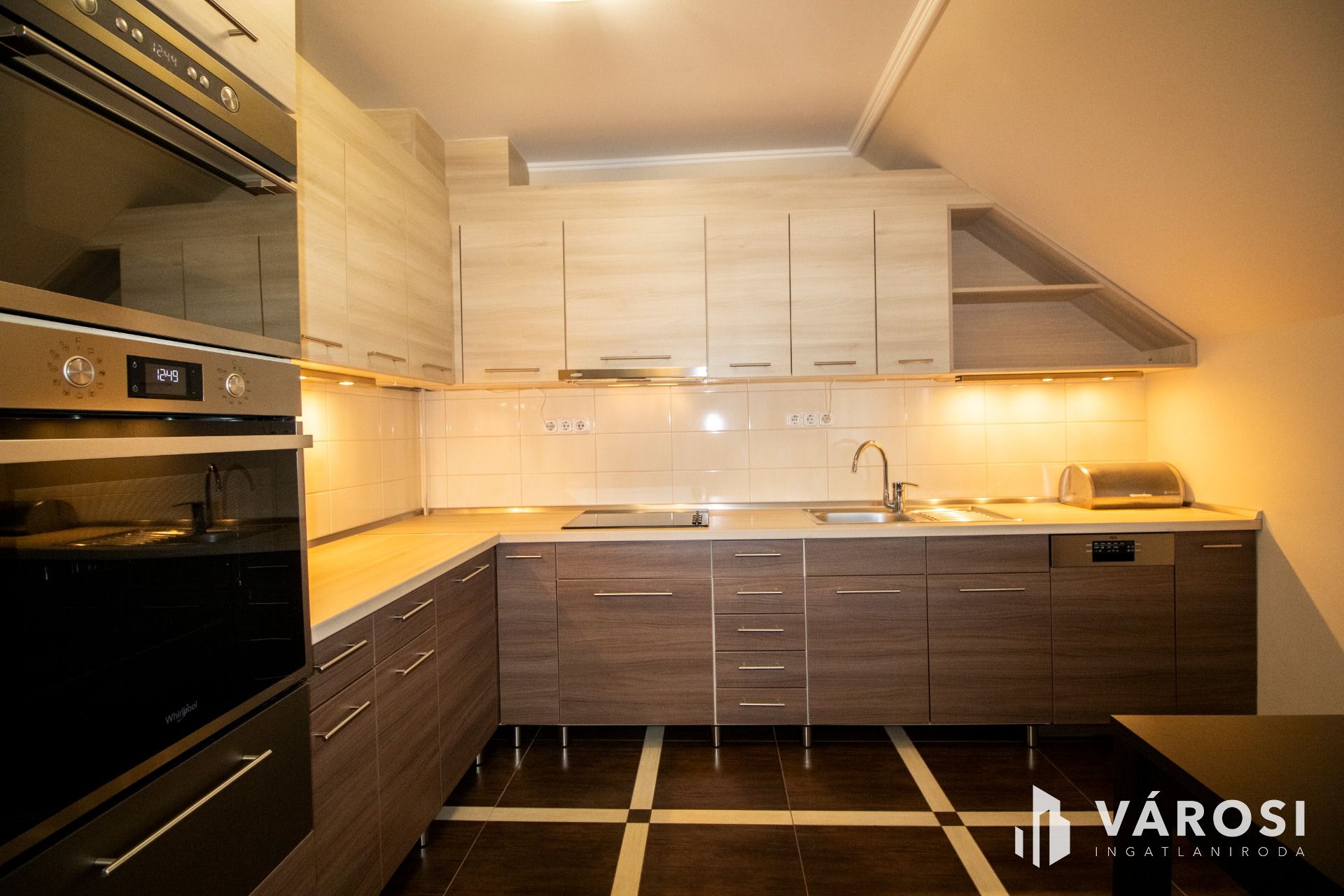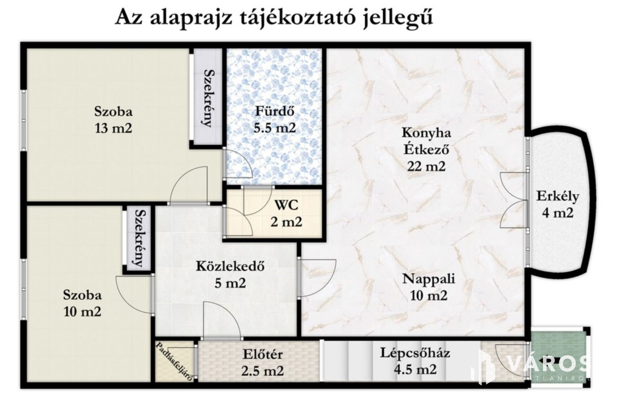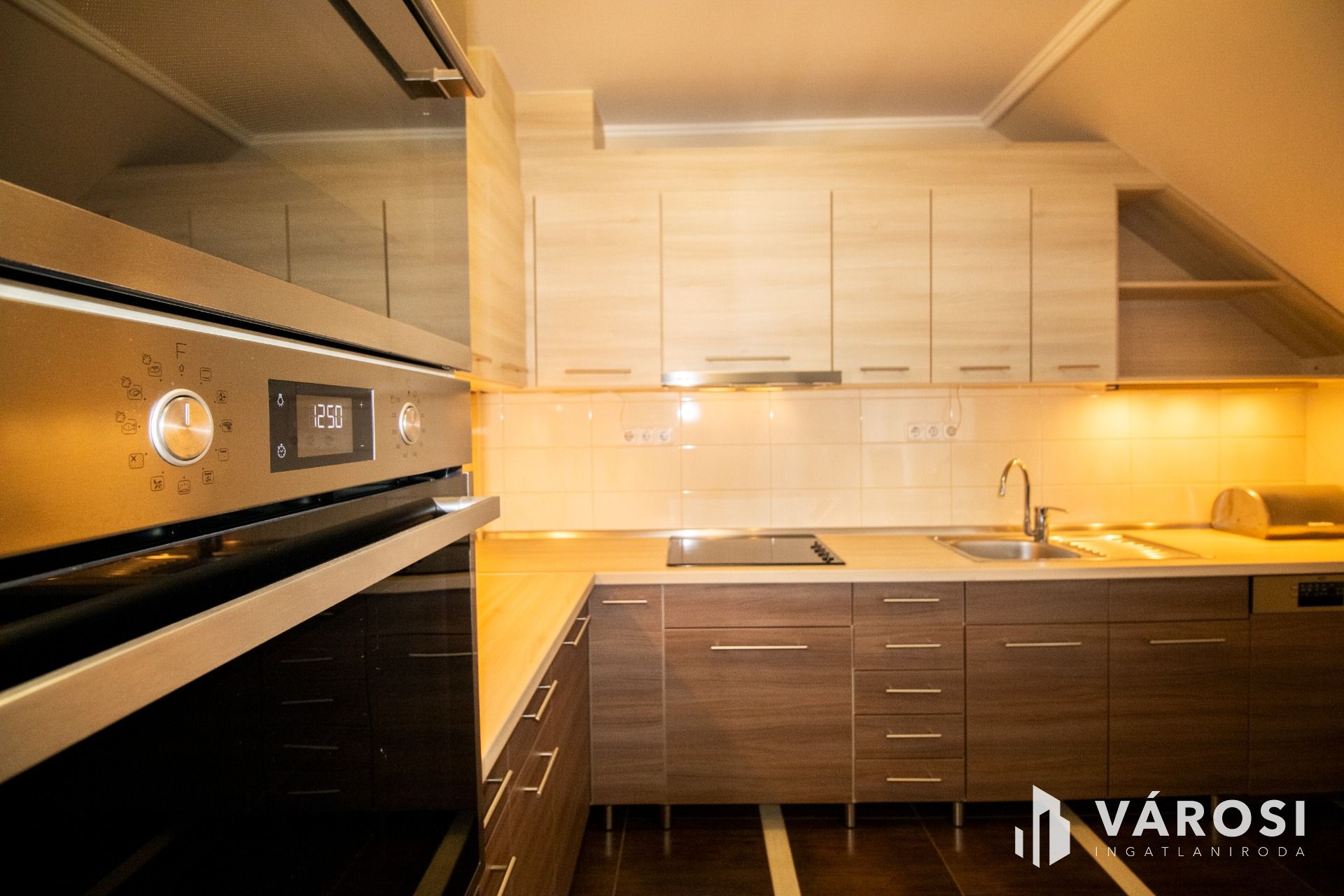 A lakás az első emeleten, a tetőtérben helyezkedik el, ahová kizárólag ehhez az ingatlanhoz tartozó, saját lépcsőházon keresztül juthatunk fel. A belső terek fiatalosak és rendkívül praktikus elrendezésűek: a közlekedőből nyílik a világos nappali és a modern konyha–étkező, amelyhez egy elegáns, kovácsoltvas korlátos erkély kapcsolódik. A két hálószoba jól szeparált, a külön WC és a mindkét irányból megközelíthető fürdőszoba pedig gondosan átgondolt, kényelmes megoldást nyújt a mindennapokban.
