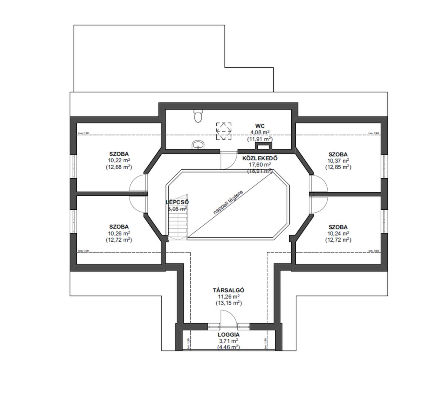 Emelet: galériás körfolyosó, 4 hálószoba, nappali, fürdőszoba + tároló, loggia