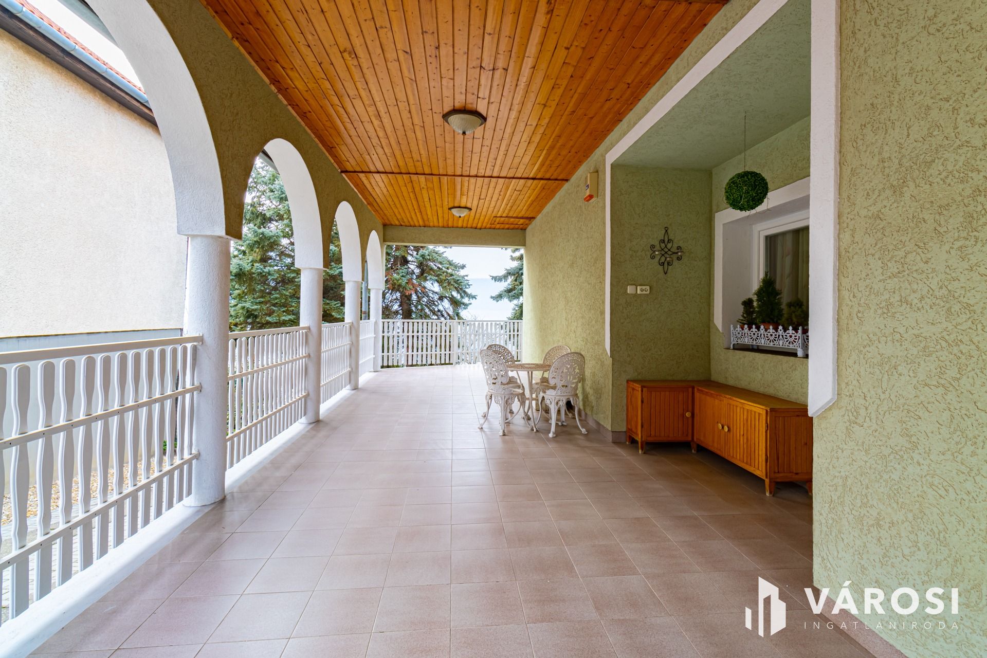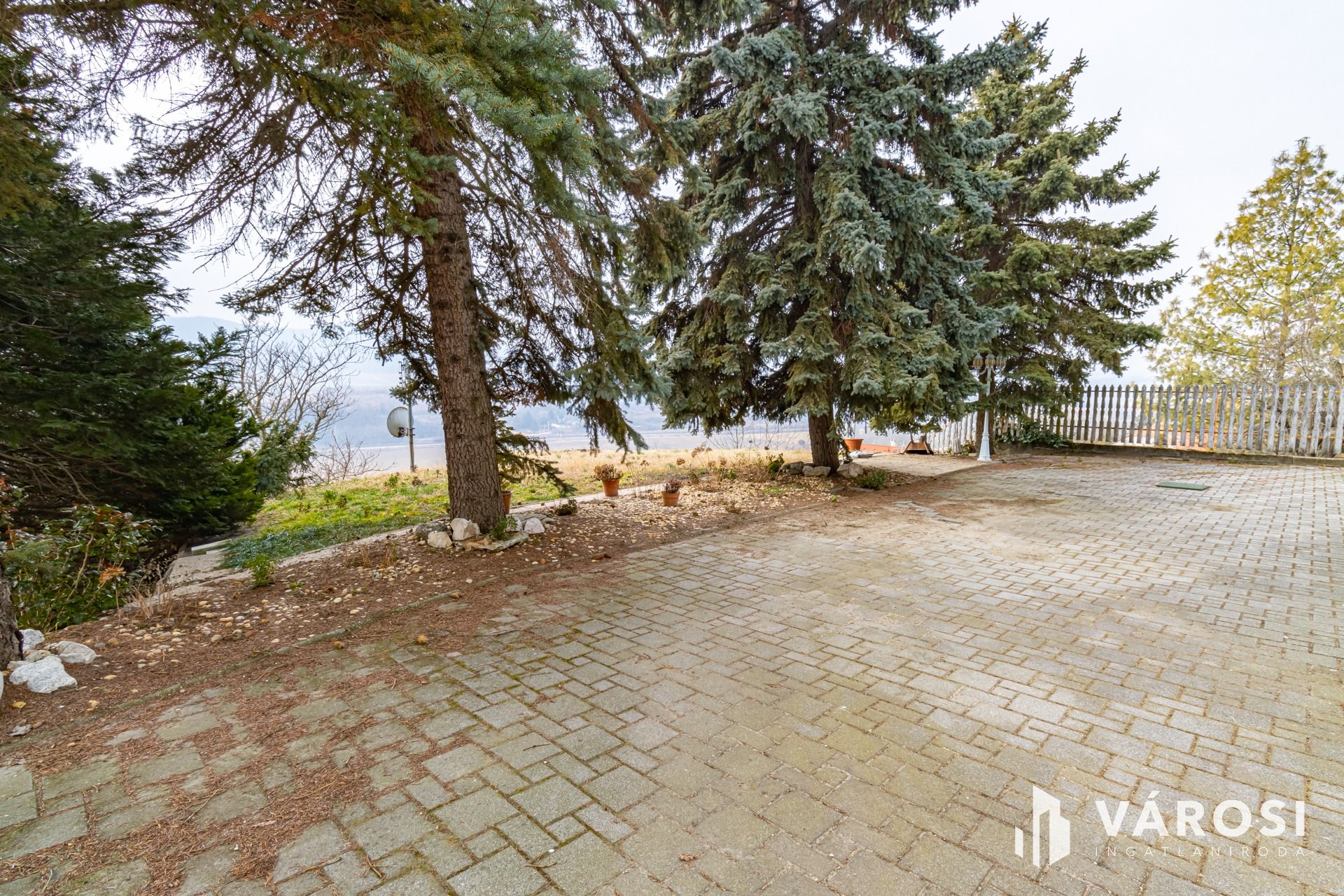 Hatalmas terasz, remek kilátás a környező dombokra, néhány hatalmas ősfenyő is található a ház előtti kertben.