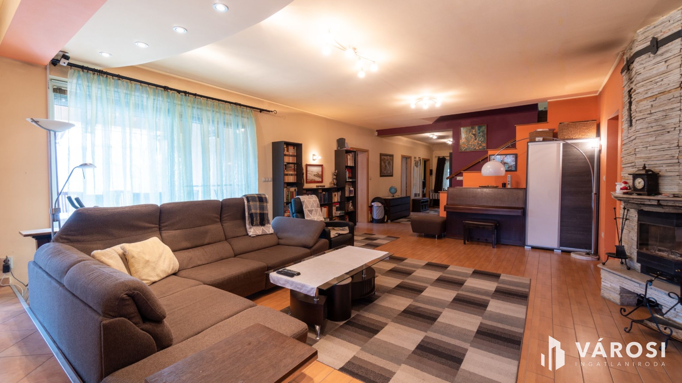Földszint: A ház szíve a panoráma kandallóval ékesített, hatalmas 62 m2-es amerikai konyhás nappali, mely egy eltolható üvegfalon keresztül közvetlen kapcsolatban áll a terasszal. Itt található még egy egyedi gyártású bútorokkal felszerelt konyha kamrával, elegáns étkező, 2 hálószoba (egyik gardróbkapcsolattal), fürdőszoba (káddal és tusolóval), külön vendég-WC, egy praktikus mosókonyha és egy dolgozószoba.