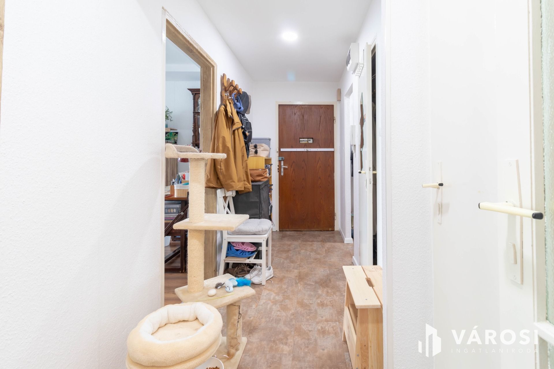 A bejárat melletti gardróbban – ahogy a fotókon látható – mosógéphez, szárítógéphez kialakított vizes csatlakozás érhető el.